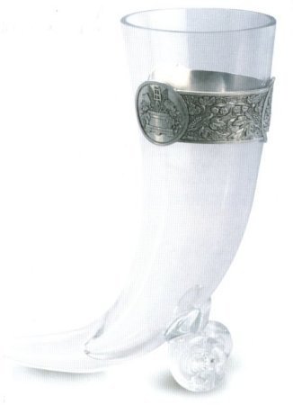 German Glass Beer Horn with Hops & Barley Pewter Decor